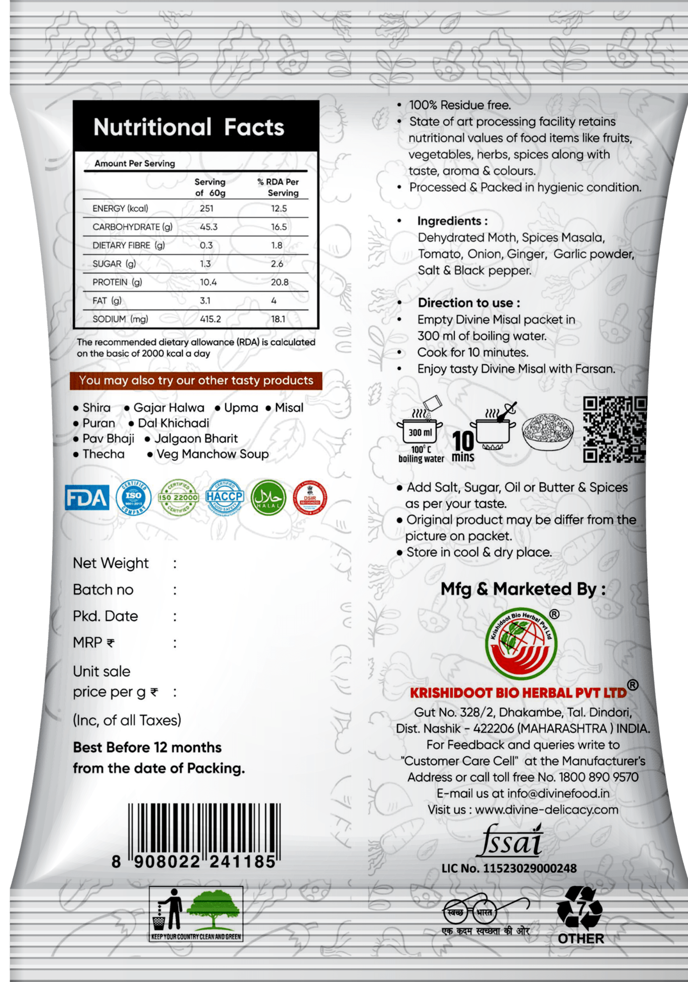Empty Divine Misal Packet in 300ml of boiling water. Cook for 10 minutes.Enjoy tasty Divine Misal with Farsan & Pav.